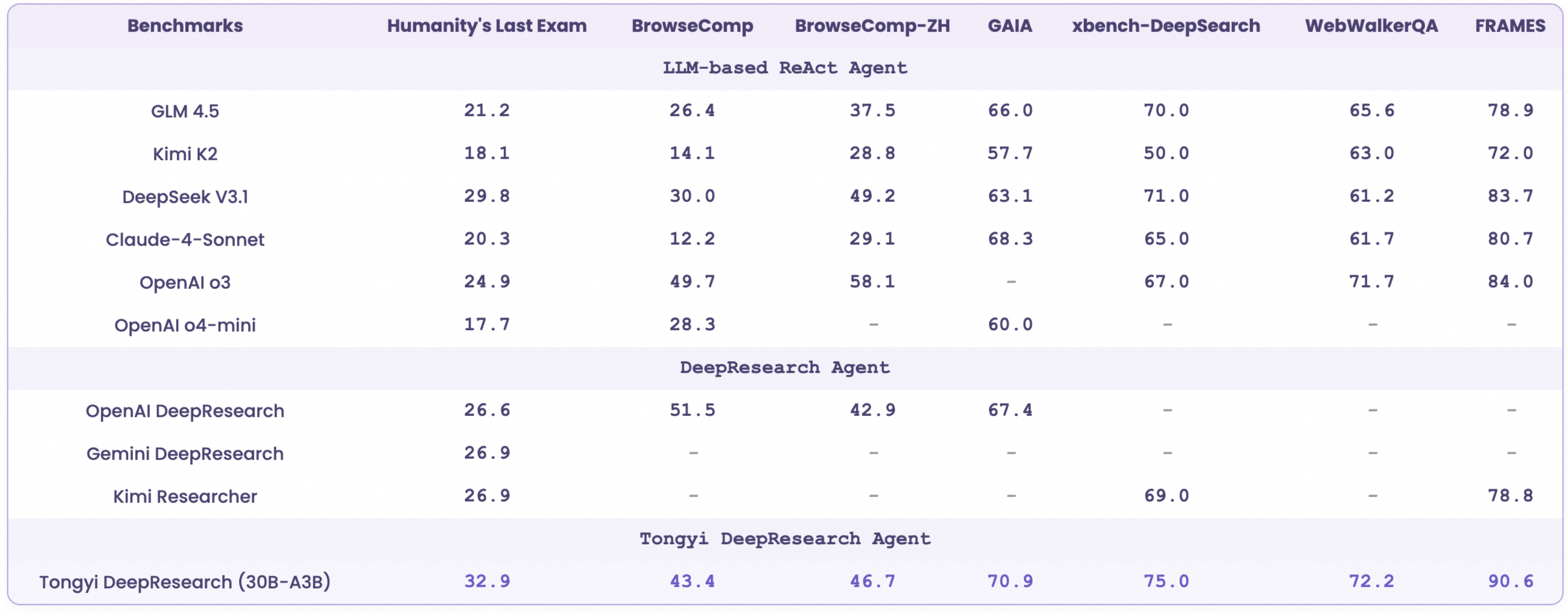 Fig 2. Tongyi DeepResearch agentic model benchmark results on several search benchmarks. More available